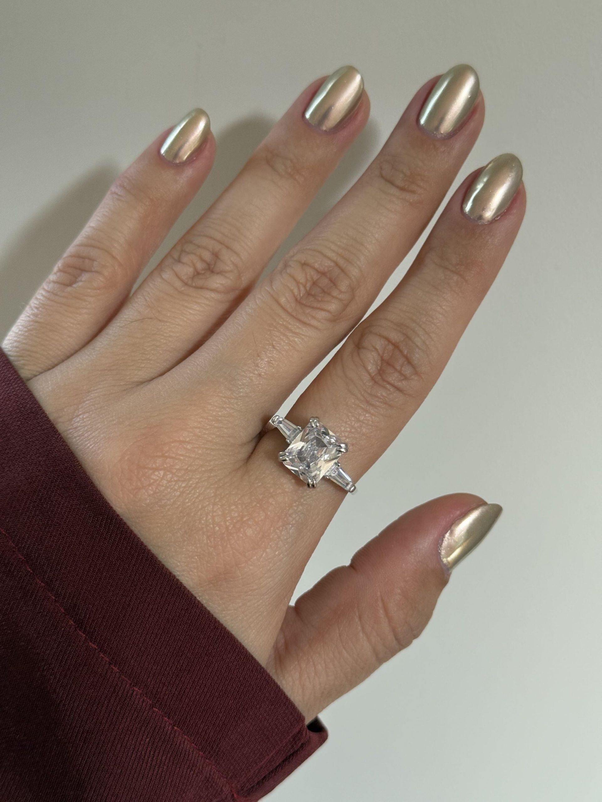 Anel em prata 925 com pedra central retangular na cor branca, de brilho puro e intenso. O aro trabalhado nas laterais adiciona riqueza de detalhes, enquanto o design harmonioso transmite uma sofisticação atemporal, perfeita para quem busca uma joia elegante e versátil.