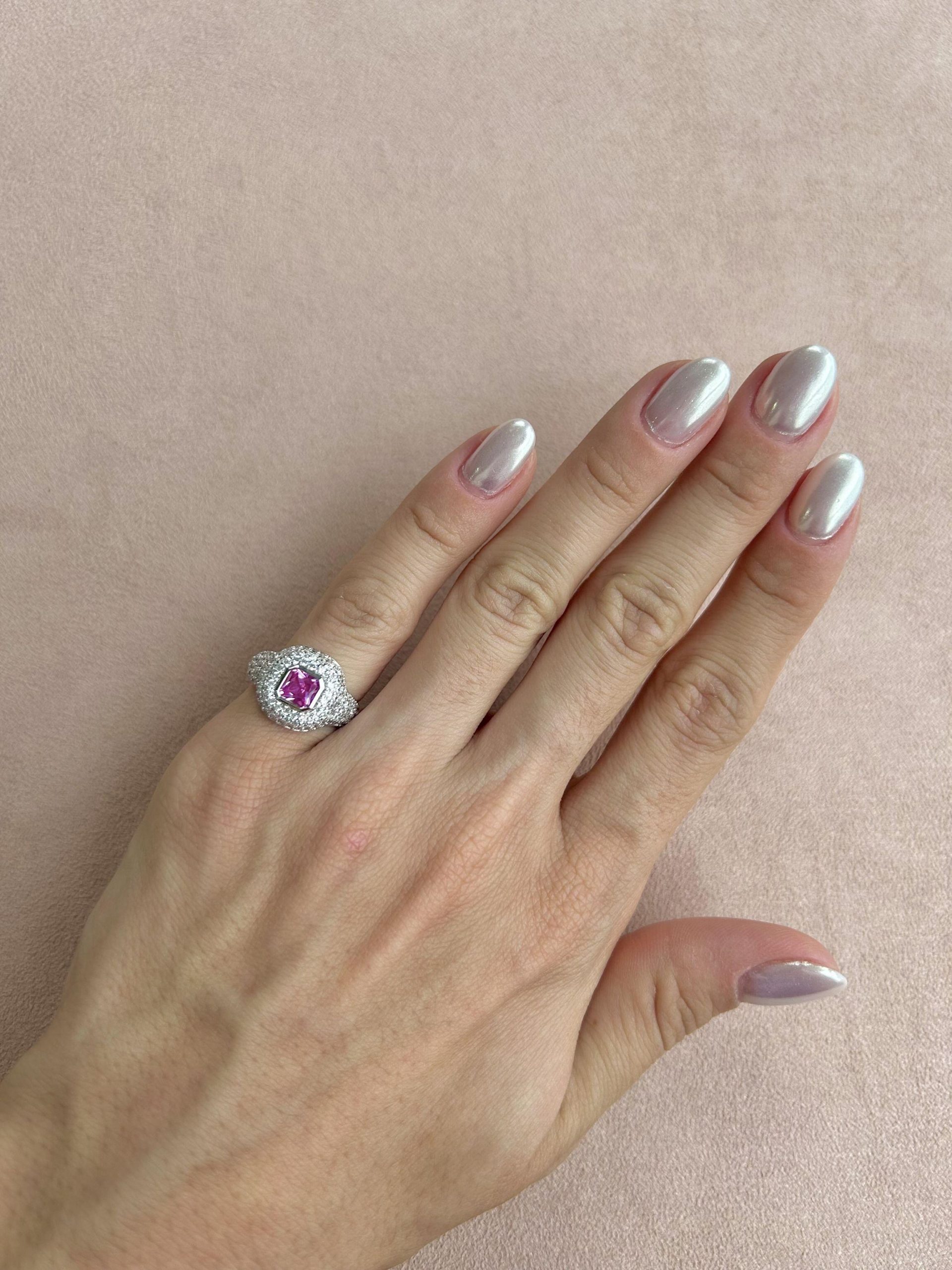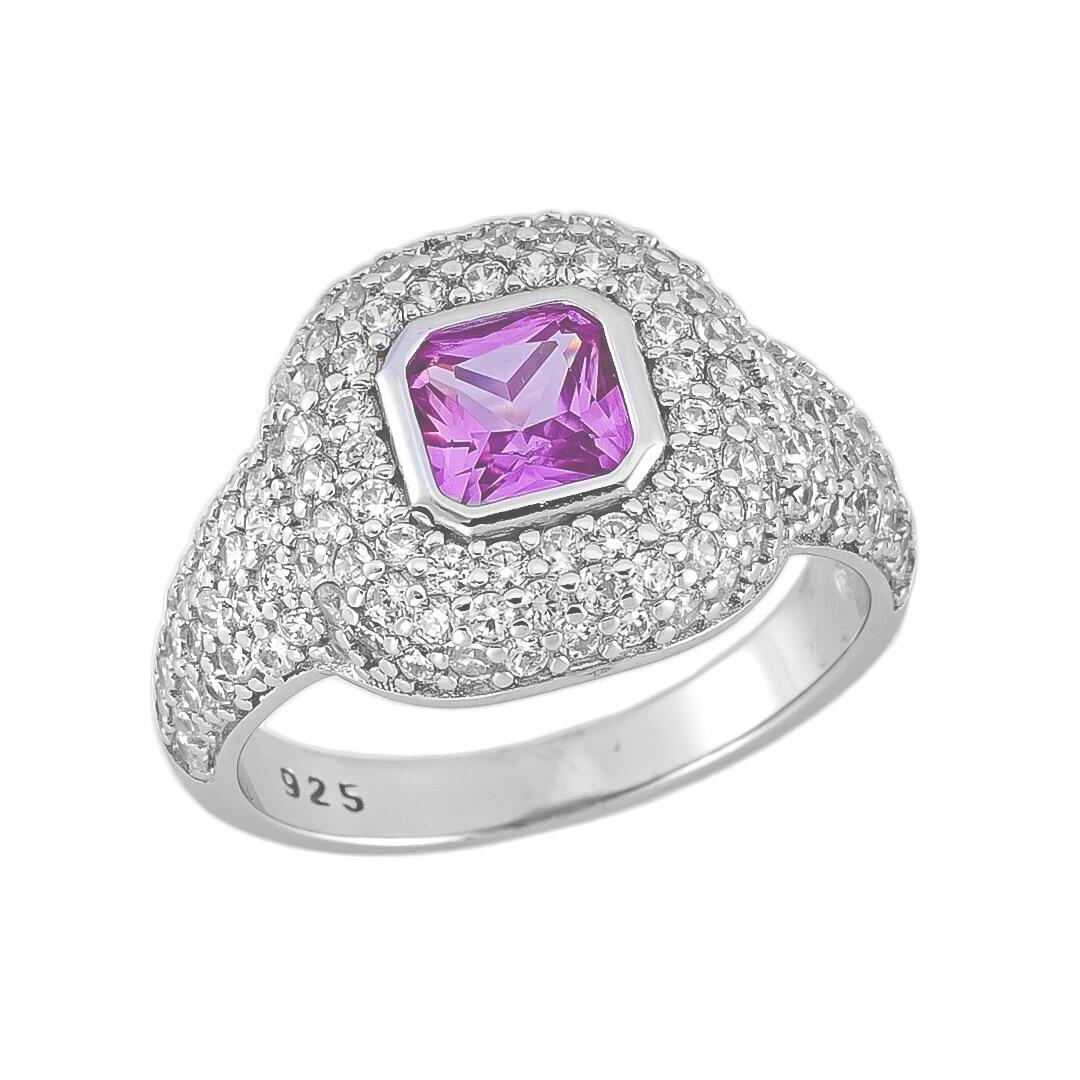 Anel de dedinho com base cravejado e formato quadrado,  com uma pedra de zircônia pink de brilho intenso. Estrutura em Prata 925 com banho de ródio, acabamento espelhado e perfil baixo para maior conforto no uso diário. Um acessório contemporâneo e marcante, ideal para compor produções com personalidade.