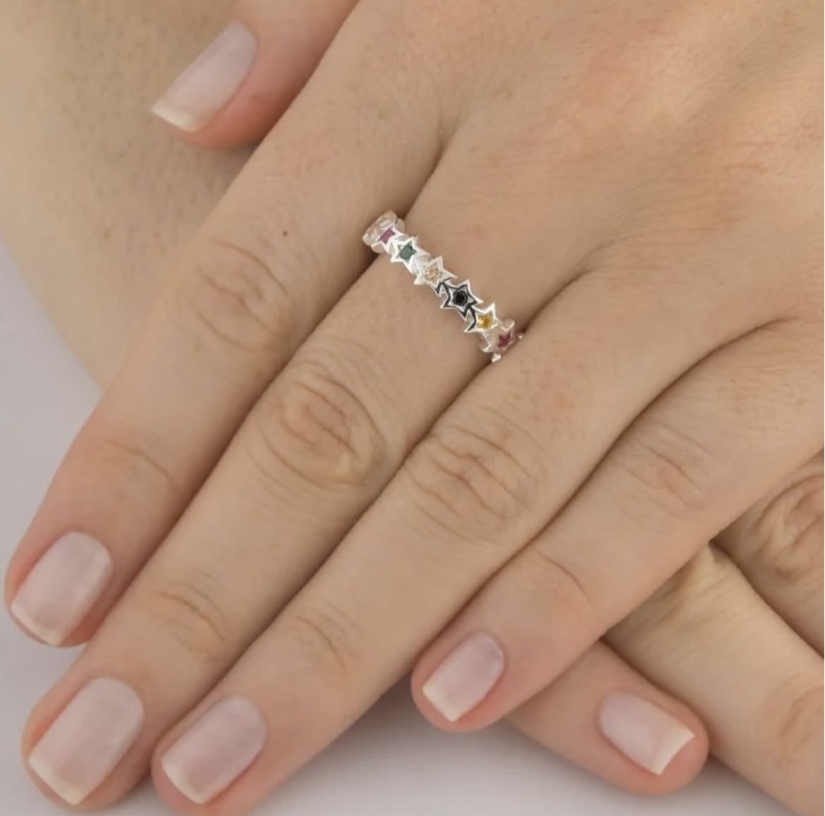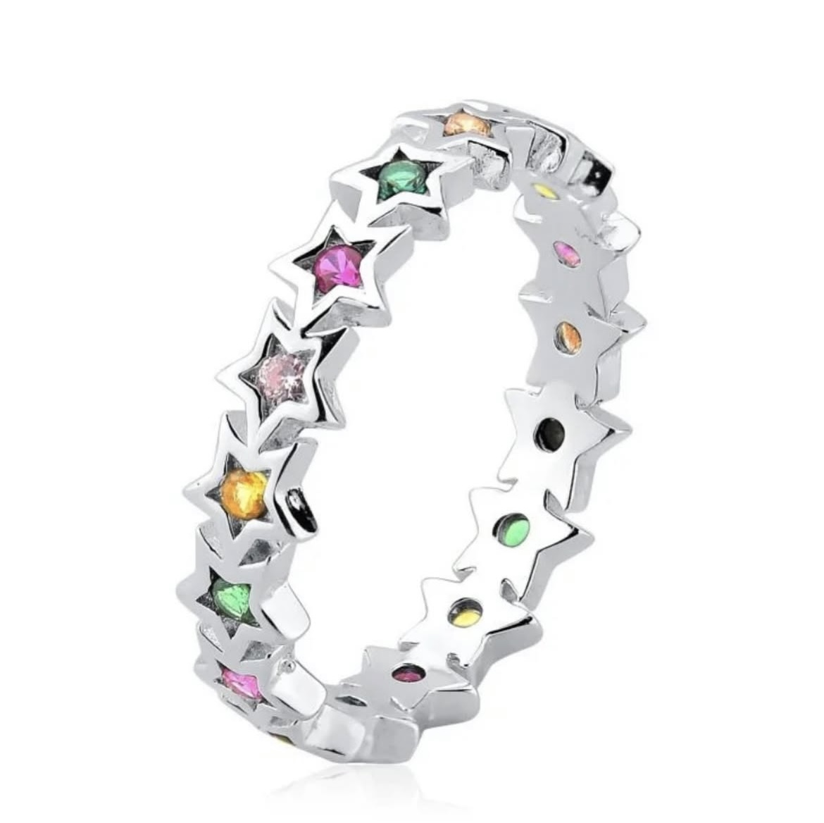 Anel delicado com mini estrelas em sequência, cravejadas com zircônias coloridas em tons vibrantes. Estrutura leve, com aro fino e acabamento polido. Um design divertido e moderno, perfeito para composições criativas e looks descontraídos com toque de cor.