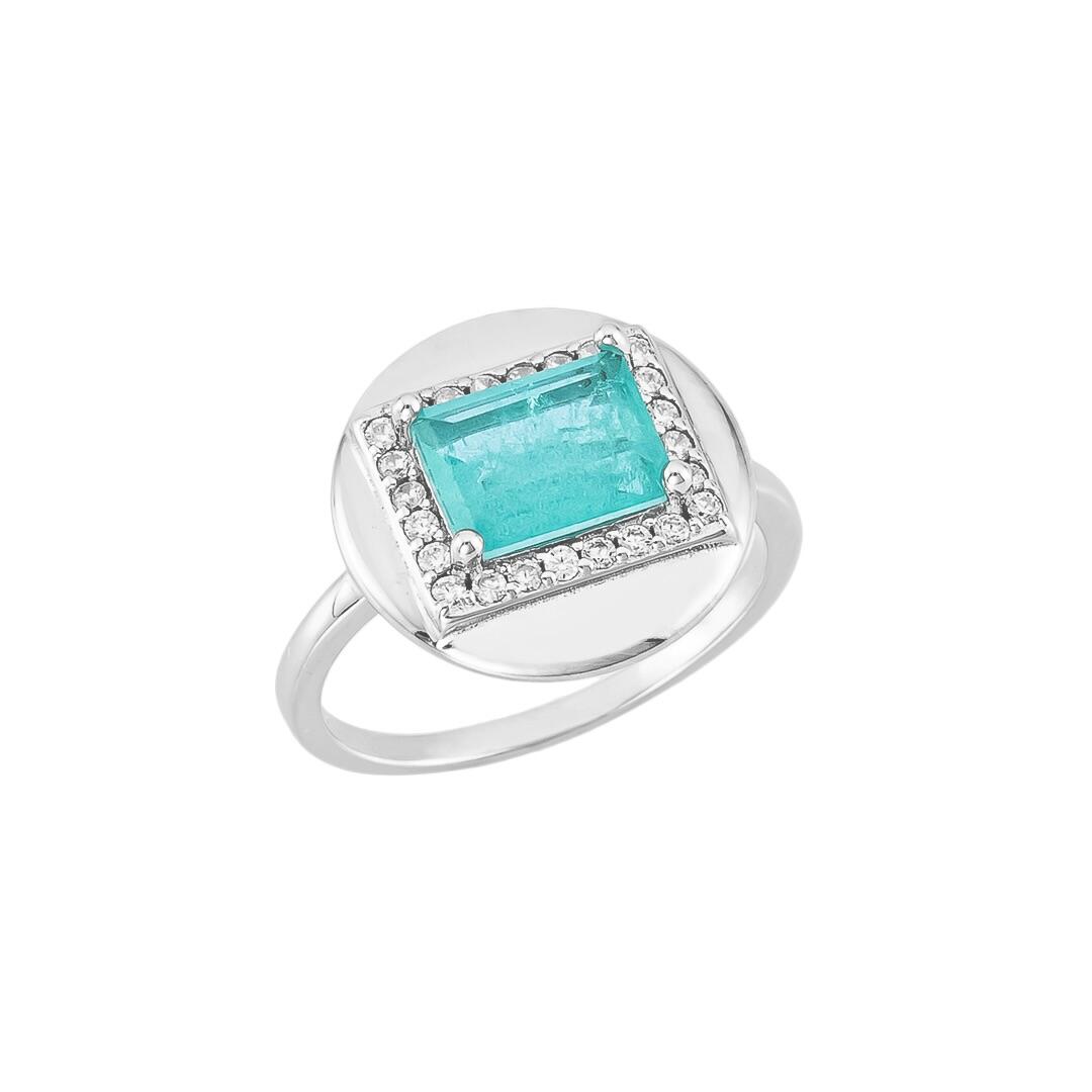 Um anel de design sofisticado, destacando uma pedra retangular  turmalina que exibe um brilho profundo e envolvente. A lapidação limpa realça a cor vibrante da gema, enquanto o aro moderno adiciona personalidade e elegância à peça.