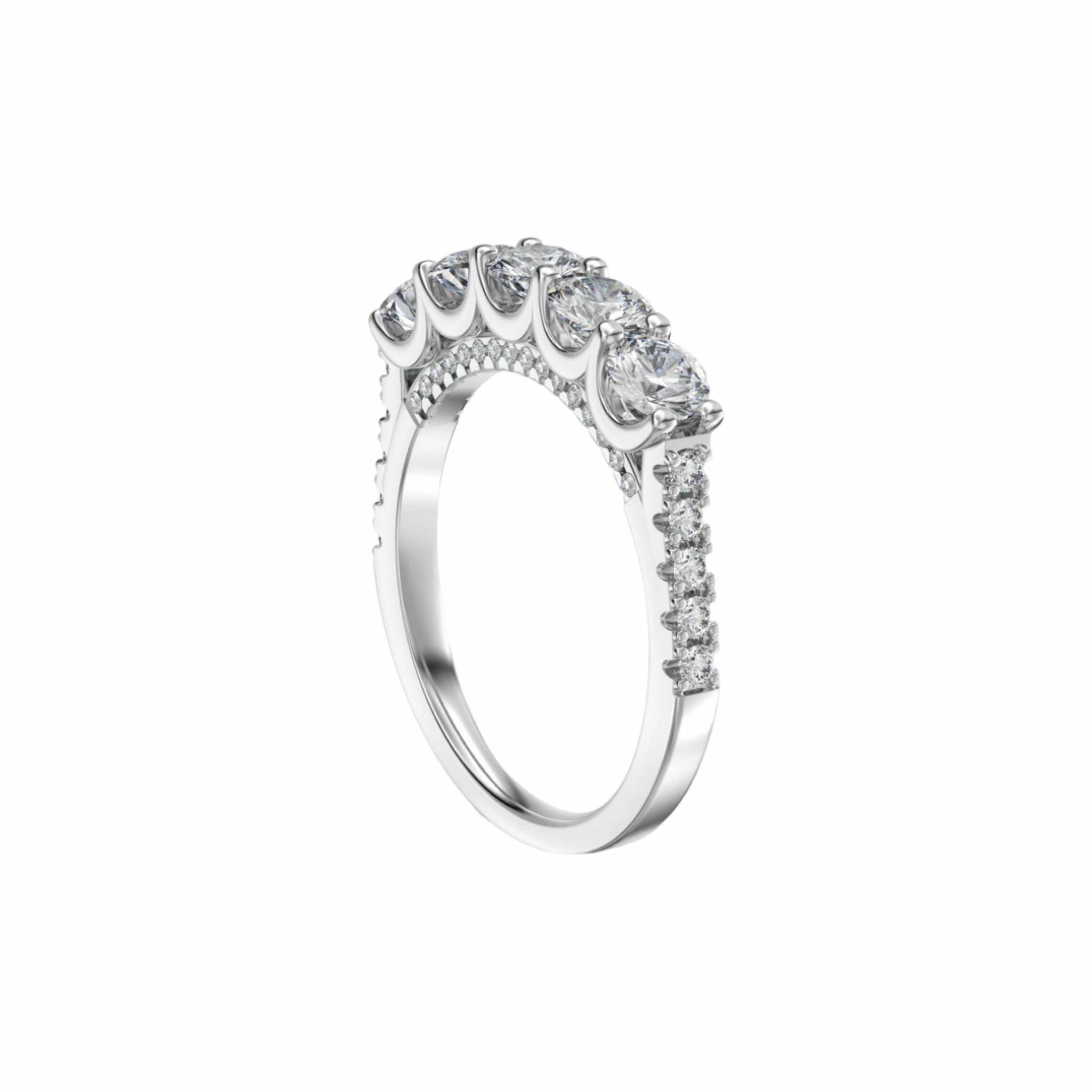 Anel em prata 925 com cinco pedras redondas em destaque, delicadamente cravejado nas laterais. Uma joia sofisticada que une brilho e elegância em cada detalhe.” ✨