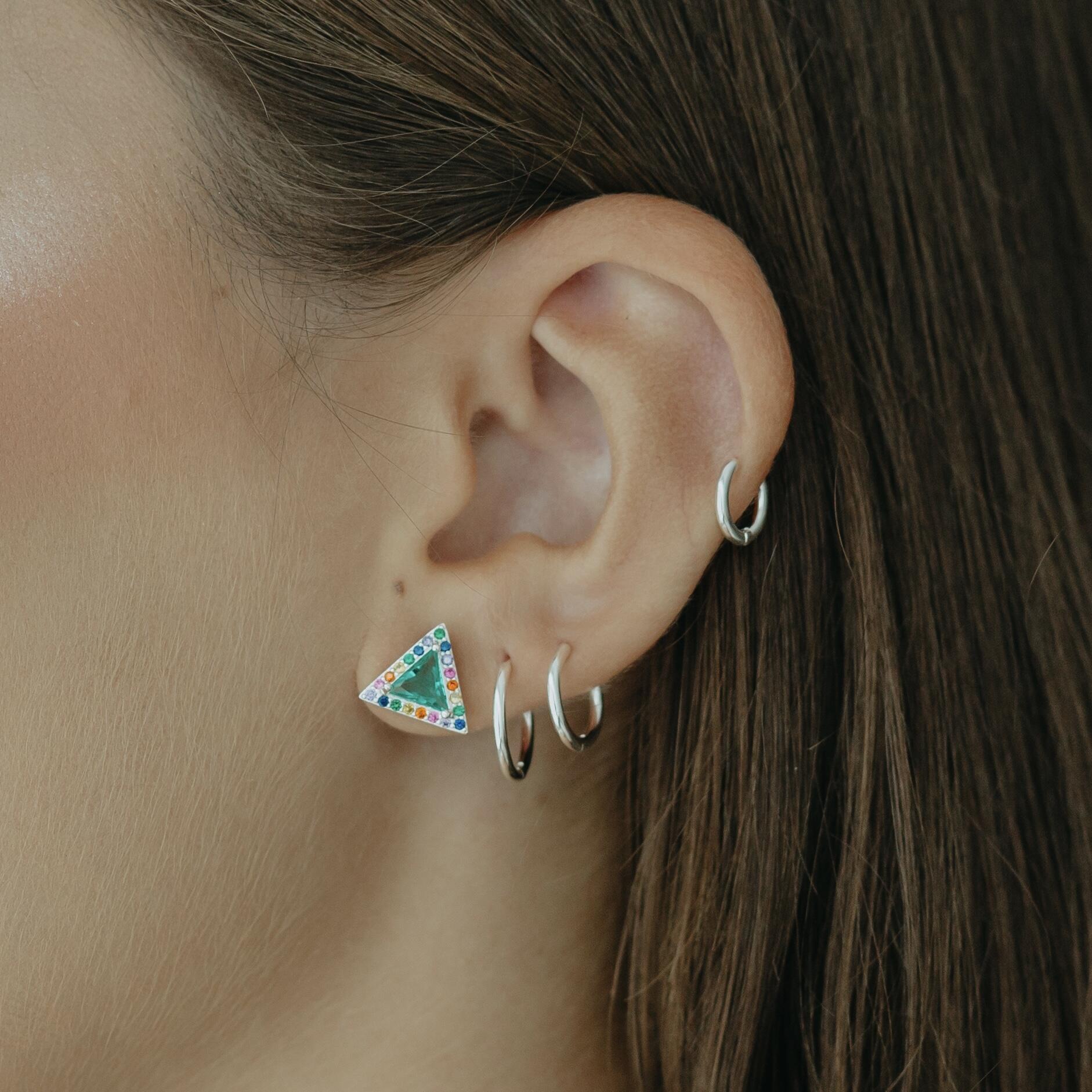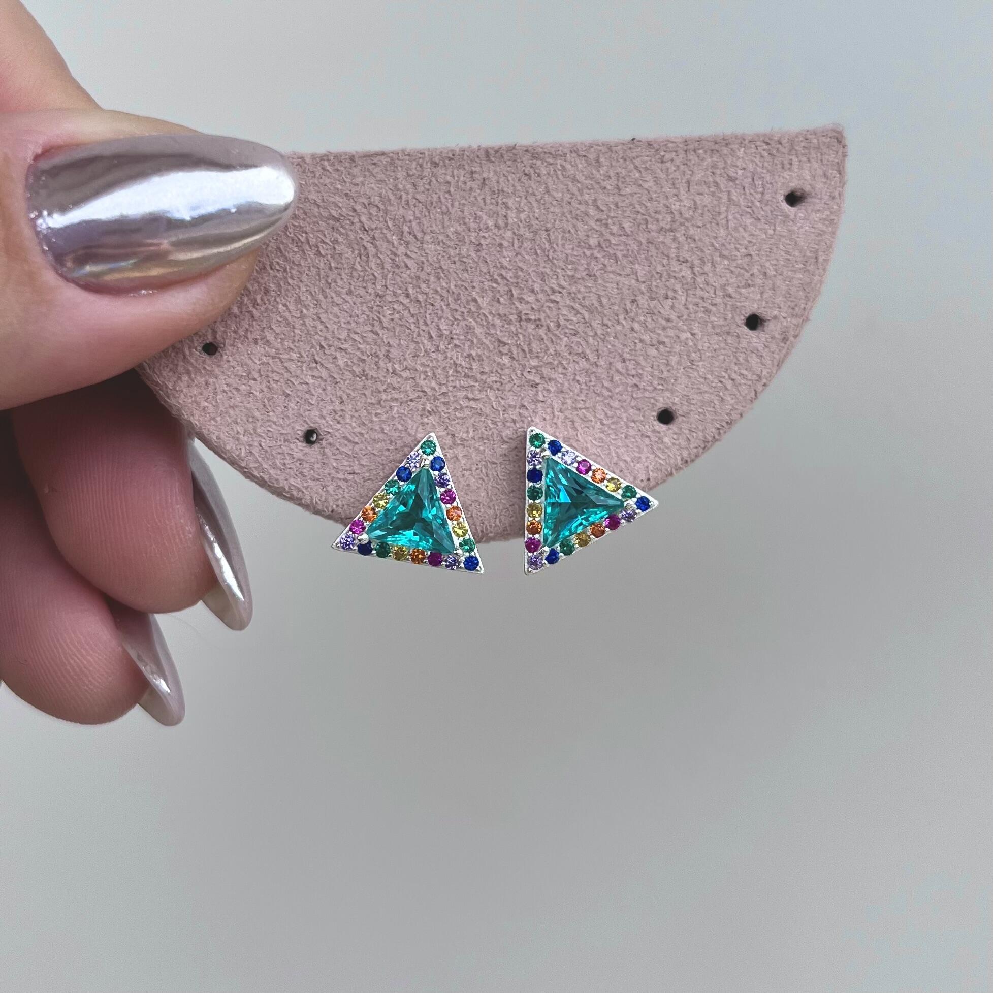 Com design moderno e elegante, este brinco traz uma pedra central em formato triangular na tonalidade turmalina, combinada com laterais cravejadas por zircônias coloridas que adicionam um toque vibrante e sofisticado. Uma peça versátil, perfeita para destacar o visual com leveza e personalidade.