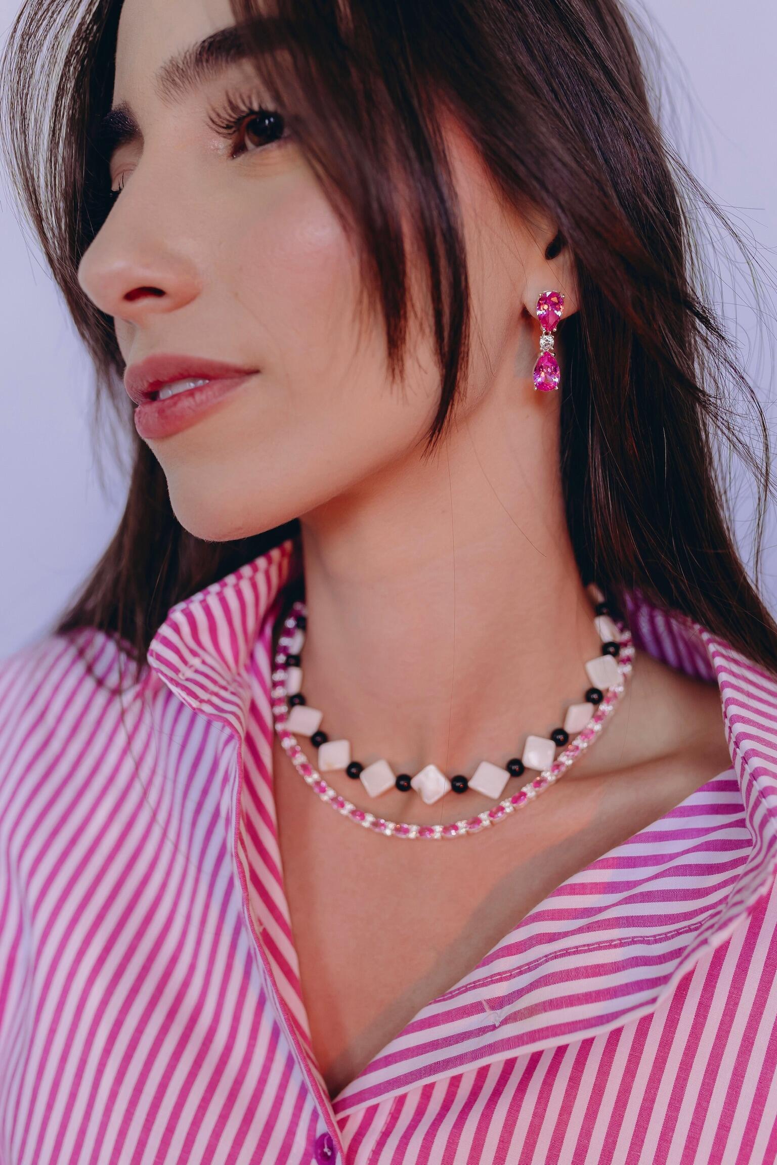 Brinco com zircônias em formato de gota pink, que traduz elegância e delicadeza em cada detalhe.